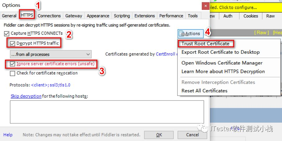 在上一篇:Fiddler基本介绍,初步了解了Fiddler 的工作原理和操作界面。Fiddler 默认不会捕获HTTPS会话,需要手动设置证书。以下介绍如何设置证书,抓取https请求。