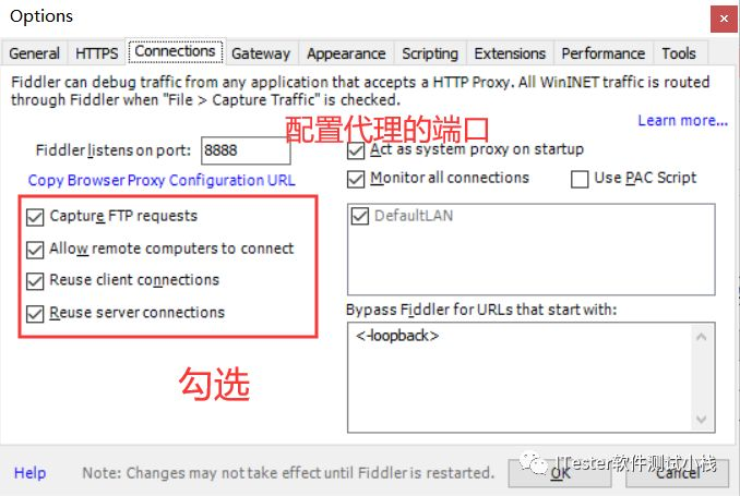 2.在菜单栏依次打开Tools->Fiddler Options->Connections: