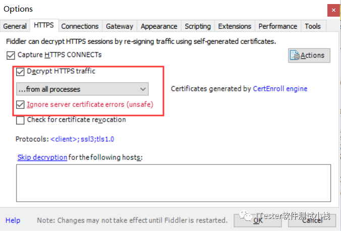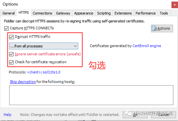1.首先在菜单栏依次打开Tools->Fiddler Options->HTTPS,如图所示:
