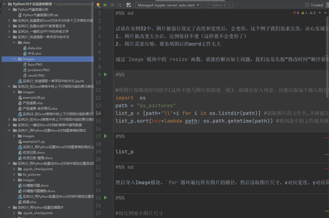 每个项目模块中,除了有代码中用到的Excel、图片、word等数据源,还有代码讲解,有助于我们学习和理解代码。