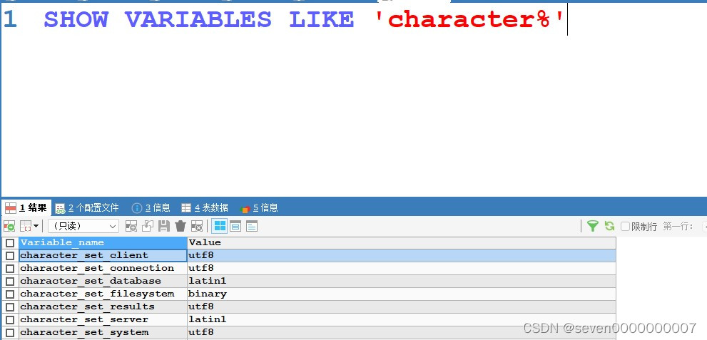 输入 show variables like 'character%' 查看数据库的编码为latin1