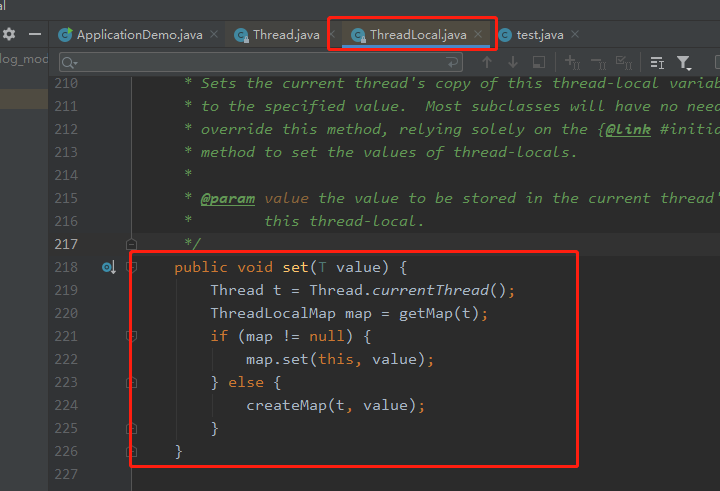 1 public class Solution { 2 3 private static ThreadLocal<String> threadLocal1 = new ThreadLocal<>() { //初始化方式1,重写 4 @Override 5 public String initialValue() { 6 return "initialVal1"; 7 } 8 }; 9 private static ThreadLocal<String> threadLocal2 = ThreadLocal.withInitial(() -> "initialVal2"); //初始化方式2 10 11 public static void method() { 12 Thread td1 = new Thread(() -> { 13 threadLocal1.set("thread1_threadLocal1"); 14 threadLocal2.set("thread1_threadLocal2"); 15 16 System.out.println("thread1_threadLocal1 : " + threadLocal1.get()); //get返回线程局部变量的副本值 17 System.out.println("thread1_threadLocal2 : " + threadLocal2.get()); 18 19 threadLocal1.remove(); 20 threadLocal2.remove(); 21 22 System.out.println("after remove : " + " threadLocal1 : " + threadLocal1.get()); 23 System.out.println("after remove : " + " threadLocal2 : " + threadLocal2.get()); 24 }); 25 26 Thread td2 = new Thread(() -> { 27 threadLocal1.set("thread2_threadLocal1"); 28 threadLocal2.set("thread2_threadLocal2"); 29 30 try { 31 Thread.sleep(2000); 32 } catch (InterruptedException e) { 33 e.printStackTrace(); 34 } 35 36 System.out.println("after sleep 2000ms, thread2_threadLocal1 : " + threadLocal1.get()); 37 System.out.println("after sleep 2000ms, thread2_threadLocal2 : " + threadLocal2.get()); 38 39 threadLocal1.remove(); 40 threadLocal2.remove(); 41 System.out.println("after remove : " + " threadLocal1 : " + threadLocal1.get()); 42 System.out.println("after remove : " + " threadLocal2 : " + threadLocal2.get()); 43 }); 44 45 td1.start(); 46 td2.start(); 47 } 48 } 49 50 /* 51 * thread1_threadLocal1 : thread1_threadLocal1 52 * thread1_threadLocal2 : thread1_threadLocal2 53 * after remove : threadLocal1 : null 54 * after remove : threadLocal2 : null 55 * after sleep 2000ms, thread2_threadLocal1 : thread2_threadLocal1 56 * after sleep 2000ms, thread2_threadLocal2 : thread2_threadLocal2 57 * after remove : threadLocal1 : null 58 * after remove : threadLocal2 : null 59 * */ 60 61 /* 62 * 每个thread下存有一个 ThreadLocal.ThreadLocalMap threadLocals, threadLocals中存放着threadLocal1、threadLocal2、threadLocal3、....,每一个threadLocal以键值对形式存在 63 * 线程局部变量,各个线程之间独立 64 * 需手动remove,否则若线程一直存在时,将导致内存泄漏 65 * */ 66 67 /* 68 * 对于初始化值,第一次调用get方法访问该值时调用初始化方法,但若在get之前调用了set方法,则不会再调用初始化方法。 69 * 正常情况下初始化方法只会被调用一次,但如果remove了,则下次get时还会再调用一次初始化方法 70 * https://www.jianshu.com/p/73a1c128c5d9 71 * */