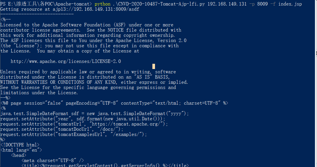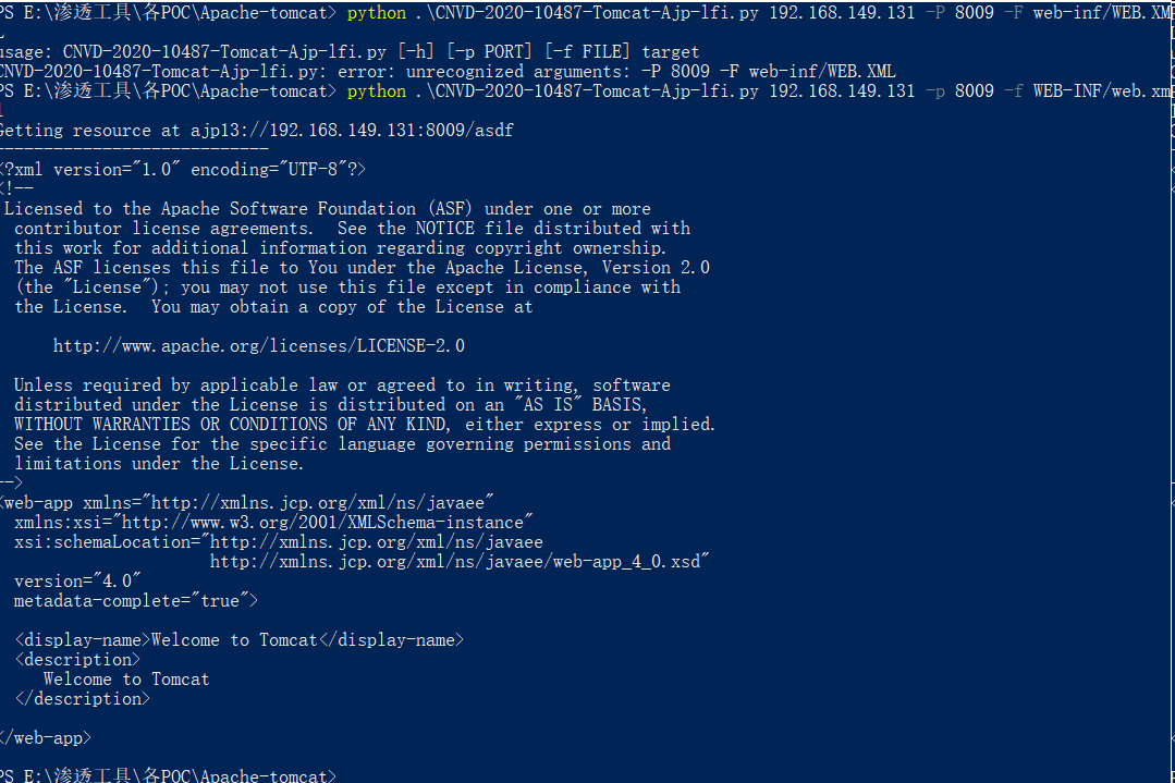 使用脚本Apache-Tomcat-Ajp漏洞POC进行测试,如下读取web.xml成功