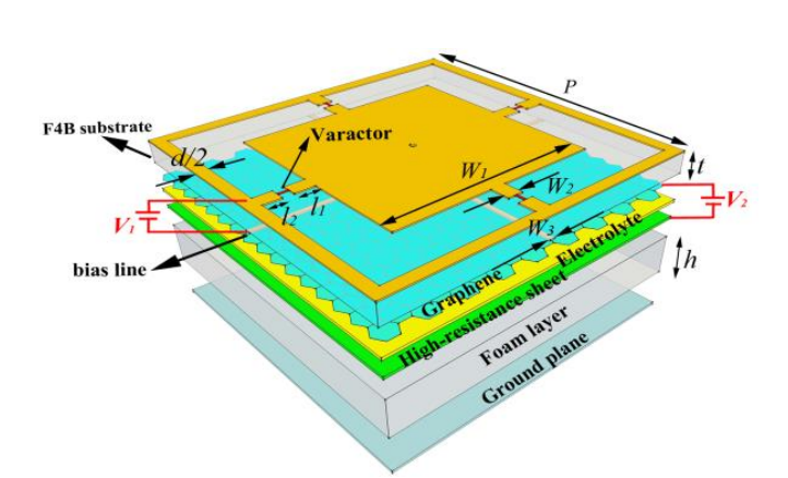 The active FSS structure is made of a metallic square ring and a square patch etched on the top side of a F4B (εs = 2.65 and tanδ =0.006) substrate with a thickness of t = 0.5 mm.活性FSS结构由金属方形环和蚀刻在厚度为t=0.5mm的F4B(εs=2.65和tanδ=0.006)基板顶部的方形贴片组成。
