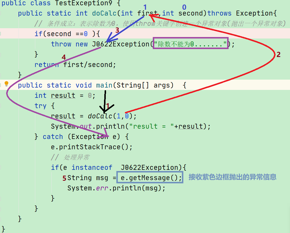 最好在最前沿(此时的最前沿是main方法)处理异常,不要在中间层(此时的中间层是doCalc方法)处理异常,中间层最好只声明异常、抛出异常