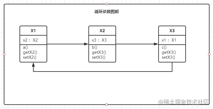 3. X3在创建时,又再次发现构造器需要X1对象;周而复始,最终抛出异常。