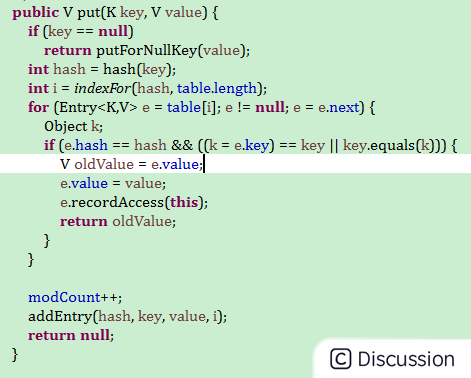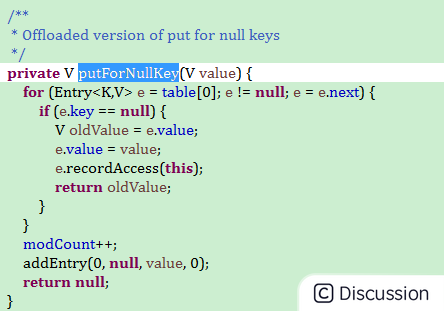 首先是判断了key是否为空,如果为空,执行了putForNullKey方法;在putForNullKey中直接存储value值;