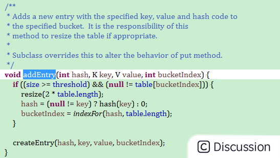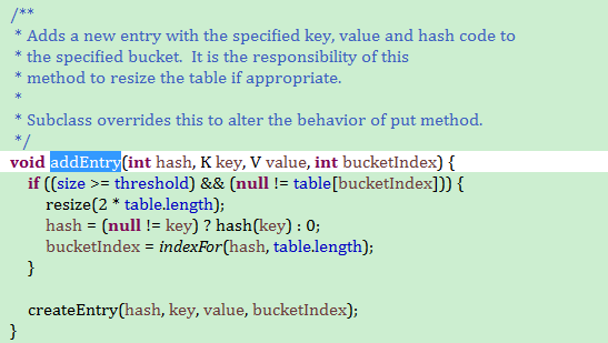 在addEntry方法中,首先看到的是一个if,对size和threshold进行了比较,而且判断了计算出来的table元素是否为空;