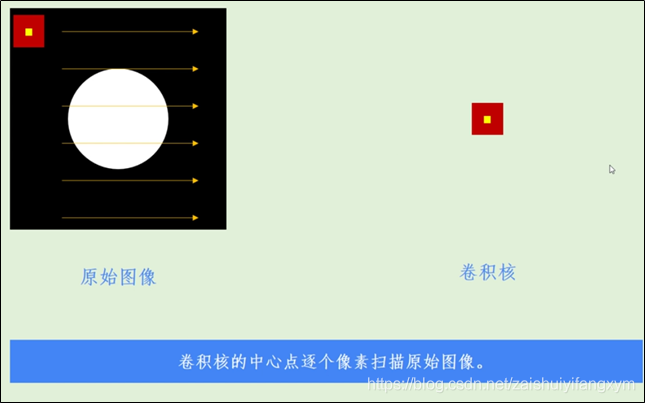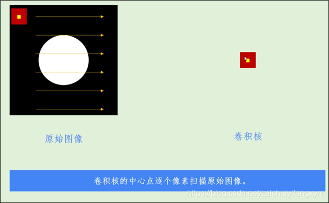 卷积核是腐蚀中的关键数组,采用numpy库可以生成。卷积核的中心点逐个像素扫描原始图像,如下图所示: