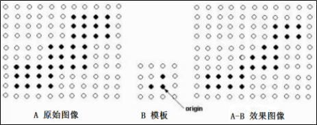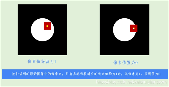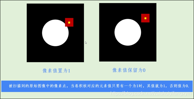被扫描到的原始图像中的像素点,只有当卷积核对应的元素值均为1时,其值才为1,否则其值修改为0。换句话说,遍历到的黄色点位置,其周围全部是白色,保留白色,否则变为黑色,图像腐蚀变小。如下图所示: