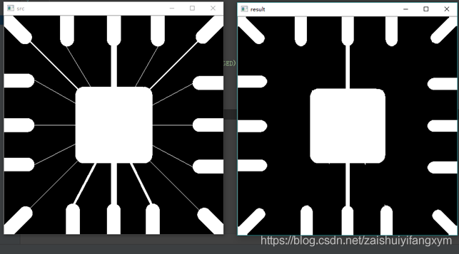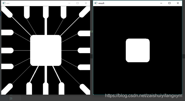 #encoding:utf-8 import cv2 import numpy as np #读取图片 src = cv2.imread('test1.bmp', cv2.IMREAD_UNCHANGED) #设置卷积核 kernel = np.ones((5,5), np.uint8) #图像腐蚀处理 erosion = cv2.erode(src, kernel) #显示图像 cv2.imshow("src", src) cv2.imshow("result", erosion) #等待显示 cv2.waitKey(0) cv2.destroyAllWindows()