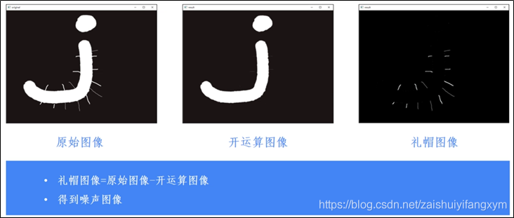 图像顶帽tophat(或图像礼帽)运算是原始图像减去图像开运算的结果,得到图像的噪声。如下图所示: