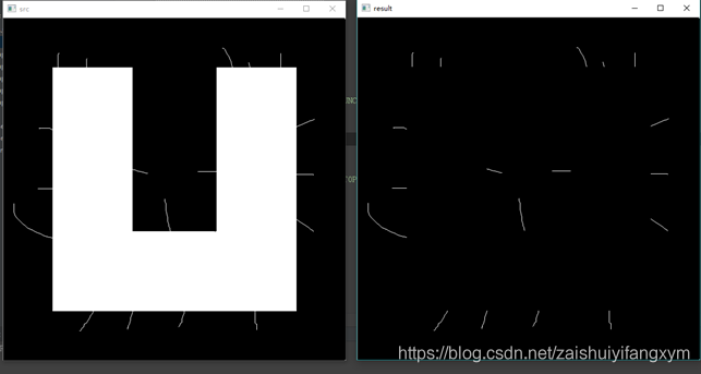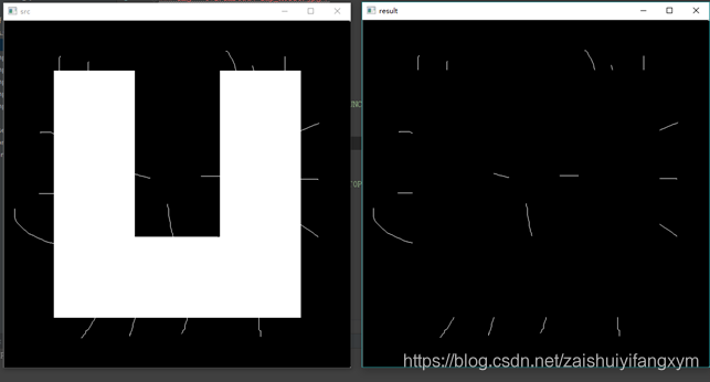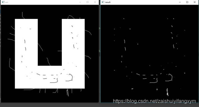 #encoding:utf-8 import cv2 import numpy as np #读取图片 src = cv2.imread('test6.bmp', cv2.IMREAD_UNCHANGED) #设置卷积核 kernel = np.ones((5,5), np.uint8) #图像闭运算 result = cv2.morphologyEx(src, cv2.MORPH_BLACKHAT, kernel) #显示图像 cv2.imshow("src", src) cv2.imshow("result", result) #等待显示 cv2.waitKey(0) cv2.destroyAllWindows()