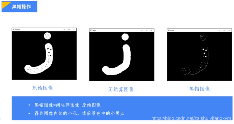 图像黑帽运算是图像闭运算操作减去原始图像的结果,得到图像内部的小孔,或者前景色中的小黑点。如下图所示: