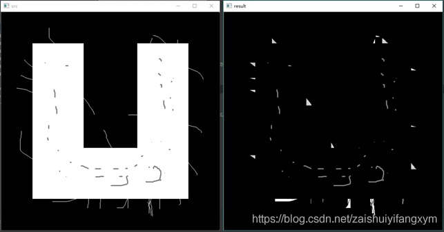 #encoding:utf-8 import cv2 import numpy as np #读取图片 src = cv2.imread('test5.bmp', cv2.IMREAD_UNCHANGED) #设置卷积核 kernel = np.ones((5,5), np.uint8) #图像闭运算 result = cv2.morphologyEx(src, cv2.MORPH_TOPHAT, kernel) #显示图像 cv2.imshow("src", src) cv2.imshow("result", result) #等待显示 cv2.waitKey(0) cv2.destroyAllWindows()