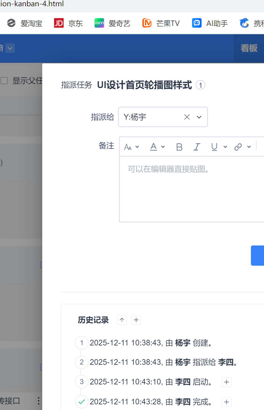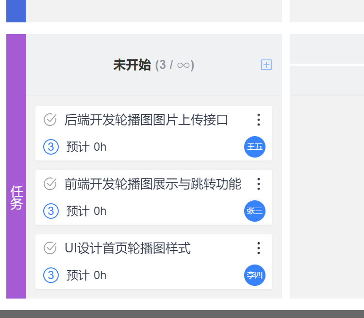 - 步骤3:拆解并分配任务——点击“任务-创建任务”,关联需求“首页增加3张轮播图功能”,任务名称分3个:①“UI设计首页轮播图样式”(负责人选李四,截止时间3天内);②“前端开发轮播图展示与跳转功能”(负责人选张三,截止时间5天内);③“后端开发轮播图图片上传接口”(负责人选张三,截止时间4天内)。