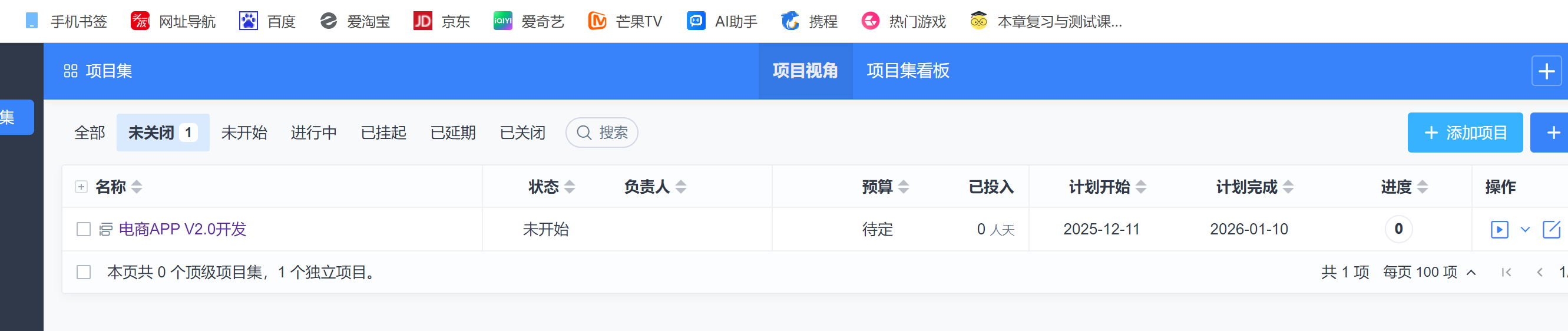 - 步骤1:创建项目并关联产品——点击“项目-创建项目”,项目名称填“电商APP V2.0开发”,开始时间选当天,结束时间选1个月后,在“关联产品”处勾选“电商APP V2.0”,点击“保存”。