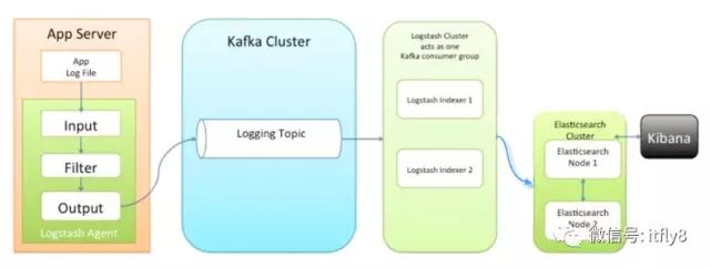 这种架构适合于较大集群的解决方案,但由于Logstash中心节点和Elasticsearch的负荷会比较重,可将他们配置为集群模式,以分担负荷,这种架构的优点在于引入了消息队列机制,均衡了网络传输,从而降低了网络闭塞尤其是丢失数据的可能性,但依然存在Logstash占用系统资源过多的问题。