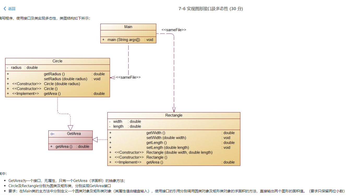 - 正则表达式相关题目有难有易,其中搜索Java关键字一题比较繁琐,类的继承、多态性使用方法以及接口的应用,有了之前作业的基础,逐步抽象,进一步体现多态与继承,。