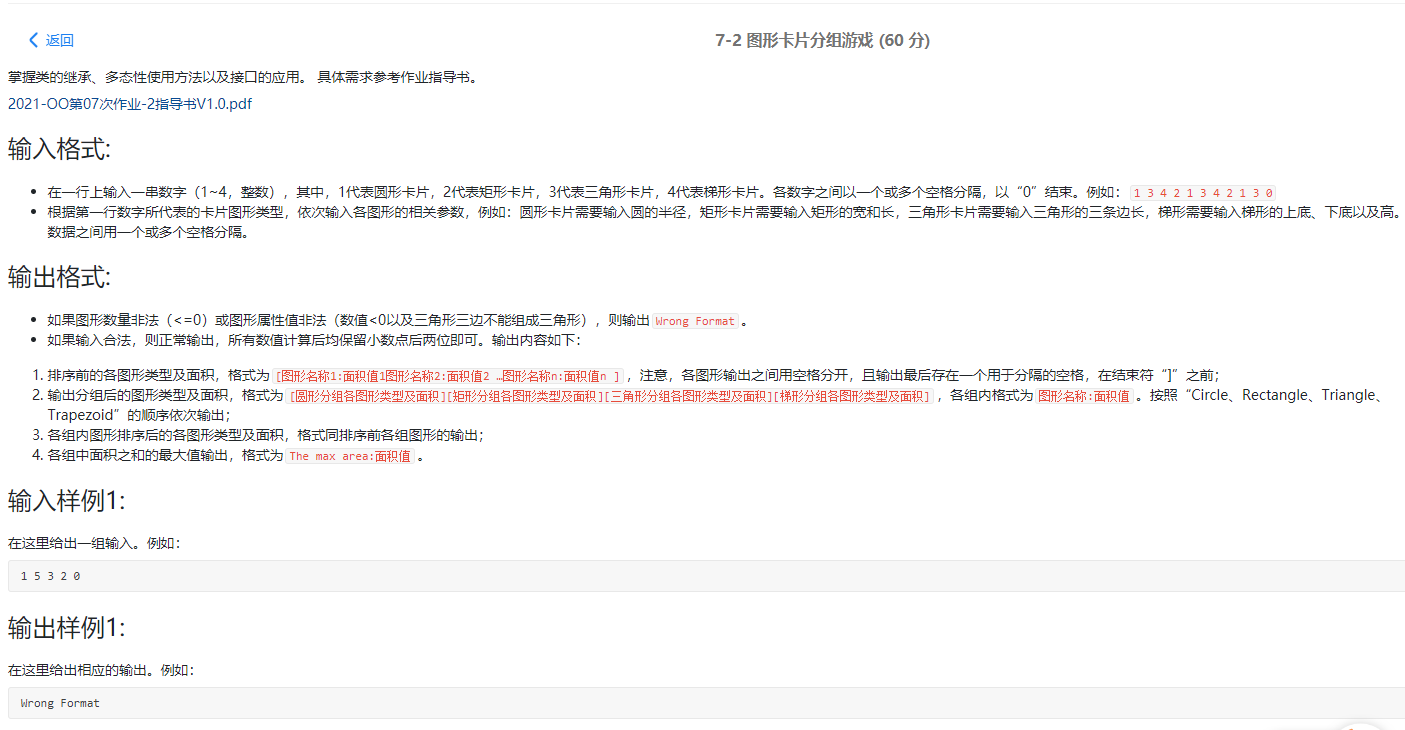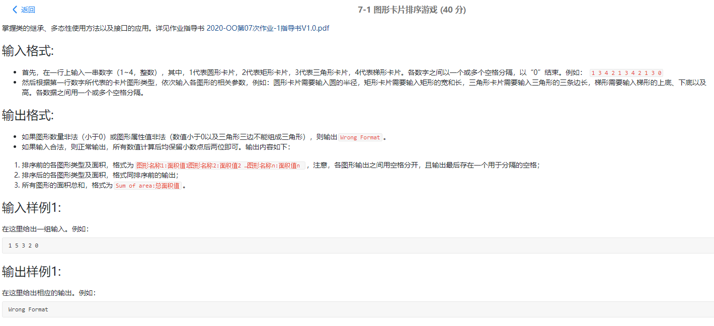 1 import java.util.*; 2 3 public class Main { 4 //在Main类中定义一个静态Scanner对象,这样在其它类中如果想要使用该对象进行输入,则直接 5 //使用Main.input.next…即可(避免采坑) 6 public static Scanner input = new Scanner(System.in); 7 public static void main(String[] args){ 8 ArrayList<Integer> list = new ArrayList<Integer>(); 9 int num = input.nextInt(); 10 while(num != 0){ 11 if(num < 0 || num > 4){ 12 System.out.println("Wrong Format"); 13 System.exit(0); 14 } 15 list.add(num); 16 num = input.nextInt(); 17 } 18 DealCardList dealCardList = new DealCardList(list); 19 if(!dealCardList.validate()){ 20 System.out.println("Wrong Format"); 21 System.exit(0); 22 } 23 dealCardList.showResult(); 24 input.close(); 25 } 26 } 27 28 abstract class Shape{ 29 String shapeName; 30 Shape(){ 31 32 } 33 Shape(String shapeName){ 34 this.shapeName = shapeName; 35 } 36 void setShapeName(String shapeName) { 37 this.shapeName = shapeName; 38 } 39 String getShapeName() { 40 return shapeName; 41 } 42 43 abstract double getArea(); 44 abstract boolean validate(); 45 public String toString() { 46 return getShapeName()+":"+String.format("%.2f",getArea()); 47 } 48 } 49 /* 50 abstract class Card extends Shape implements Comparable<Shape>{ 51 private Shape shape; 52 public int compareTo(Card o) { 53 if(this.getArea() < o.getArea()) 54 return -1; 55 else if(this.getArea() > o.getArea()) 56 return 1; 57 else 58 return 0; 59 } 60 Card(){ 61 62 } 63 Card(Shape shape){ 64 this.shape = shape; 65 } 66 Shape getShape() { 67 return shape; 68 } 69 void setShape(Shape shape) { 70 this.shape = shape; 71 } 72 }*/ 73 //这个地方不太一样 74 class Card implements Comparable<Card>{ 75 private Shape shape; 76 @Override 77 public int compareTo(Card o) { 78 if(shape.getArea() < o.getShape().getArea()) 79 return -1; 80 else if(shape.getArea() > o.getShape().getArea()) 81 return 1; 82 else 83 return 0; 84 } 85 Card(){ 86 87 } 88 Card(Shape shape){ 89 this.shape = shape; 90 } 91 Shape getShape() { 92 return shape; 93 } 94 void setShape(Shape shape) { 95 this.shape = shape; 96 } 97 } 98 99 class Trapezoid extends Shape{ 100 private double topside; 101 private double bottomside; 102 private double height; 103 Trapezoid(){ 104 105 } 106 Trapezoid(double topside, double bottomside, double height){ 107 this.topside = topside; 108 this.bottomside = bottomside; 109 this.height = height; 110 } 111 @Override 112 double getArea() { 113 return (1/2)*height*(topside+bottomside); 114 } 115 116 @Override 117 boolean validate() { 118 if(topside>0 && bottomside>0 && height>0) 119 return true; 120 else 121 return false; 122 } 123 124 /*@Override 125 public String toString() { 126 // TODO Auto-generated method stub 127 return null; 128 }*/ 129 130 } 131 132 class Circle extends Shape{ 133 private double radius; 134 Circle(double radius){ 135 this.radius = radius; 136 } 137 void setRadius(double radius) { 138 this.radius = radius; 139 } 140 double getRadius() { 141 return radius; 142 } 143 @Override 144 double getArea() { 145 return Math.PI*radius*radius; 146 } 147 @Override 148 boolean validate() { 149 if(radius>0) 150 return true; 151 else 152 return false; 153 } 154 /*@Override 155 public String toString() { 156 return null; 157 }*/ 158 } 159 160 class Rectangle extends Shape{ 161 private double length; 162 private double width; 163 Rectangle(double length, double width){ 164 this.length = length; 165 this.width = width; 166 } 167 @Override 168 double getArea() { 169 return length * width; 170 } 171 172 @Override 173 boolean validate() { 174 if(width > 0 && length >0) 175 return true; 176 else 177 return false; 178 } 179 180 /*@Override 181 public String toString() { 182 return null; 183 }*/ 184 } 185 186 class Triangle extends Shape{ 187 double side1; 188 double side2; 189 double side3; 190 Triangle(double side1, double side2,double side3){ 191 this.side1 = side1; 192 this.side2 = side2; 193 this.side3 = side3; 194 } 195 196 197 @Override 198 double getArea() { 199 // TODO Auto-generated method stub 200 double p = (side1+side2+side3)/2; 201 return Math.sqrt(p*(p-side1)*(p-side2)*(p-side3)); 202 } 203 @Override 204 boolean validate() { 205 // TODO Auto-generated method stub 206 if(side1>0 && side2>0 && side3>0 207 && side1+side2>side3 208 && side2+side3>side1 209 && side1+side3>side2) 210 return true; 211 else 212 return false; 213 } 214 /*@Override 215 public String toString() { 216 // TODO Auto-generated method stub 217 return null; 218 }*/ 219 } 220 class DealCardList { 221 ArrayList<Card> cardList = new ArrayList<>(); 222 public DealCardList(){ 223 } 224 public void cardSort(){ 225 TreeSet<Card> cards = new TreeSet<>(cardList); 226 for (Card card : cards) { 227 System.out.print(card.getShape()); 228 } 229 } 230 231 public boolean validate() { 232 for(Card card : cardList) { 233 if(!card.getShape().validate()) { 234 return false; 235 } 236 } 237 return true; 238 } 239 /* 240 DealCardList(ArrayList<Integer> list){ 241 this.cardList= cardList; 242 }*/ 243 public DealCardList(ArrayList<Integer> card){ 244 for(Integer choice : card) { 245 if(choice==0) break; 246 switch(choice) { 247 248 case 2: 249 Card card2 = new Card(new Rectangle(Main.input.nextDouble(),Main.input.nextDouble())); 250 cardList.add(card2); 251 card2.getShape().setShapeName("Rectangle"); 252 break; 253 case 1: 254 Card card1 = new Card(new Circle(Main.input.nextDouble())); 255 cardList.add(card1); 256 card1.getShape().setShapeName("Circle"); 257 break; 258 case 3 : 259 Card card3 = new Card(new Triangle(Main.input.nextDouble(),Main.input.nextDouble(),Main.input.nextDouble())); 260 card3.getShape().setShapeName("Triangle"); 261 cardList.add(card3); 262 break; 263 case 4: 264 Card card4=new Card(new Trapezoid(Main.input.nextDouble(),Main.input.nextDouble(),Main.input.nextDouble())); 265 card4.getShape().setShapeName("Trapezoid"); 266 cardList.add(card4); 267 break; 268 default:System.out.println("Wrong Format"); 269 } 270 } 271 } 272 public doubl