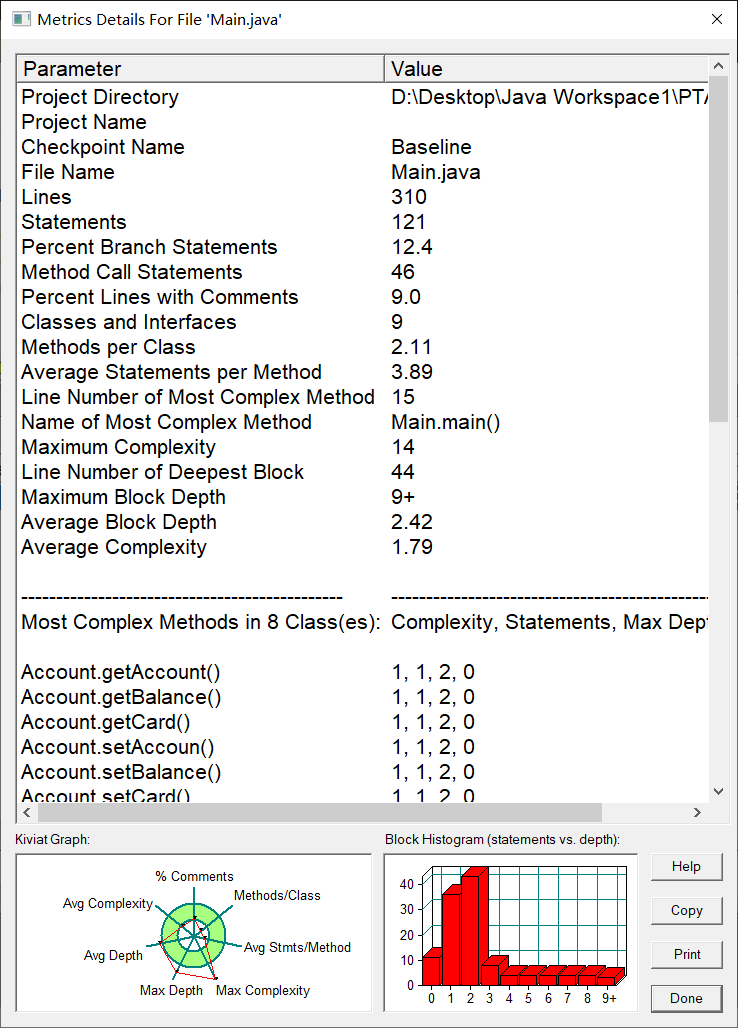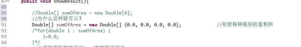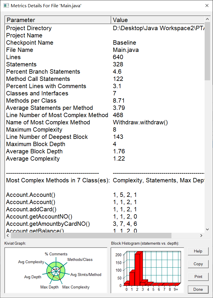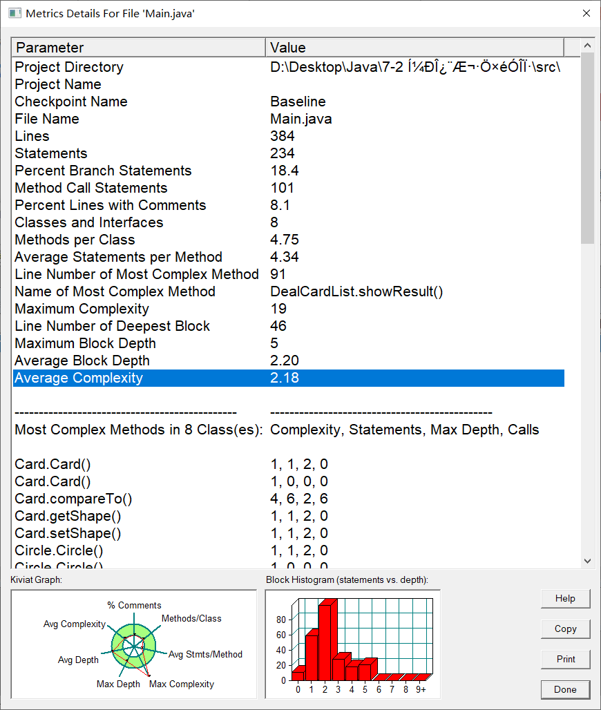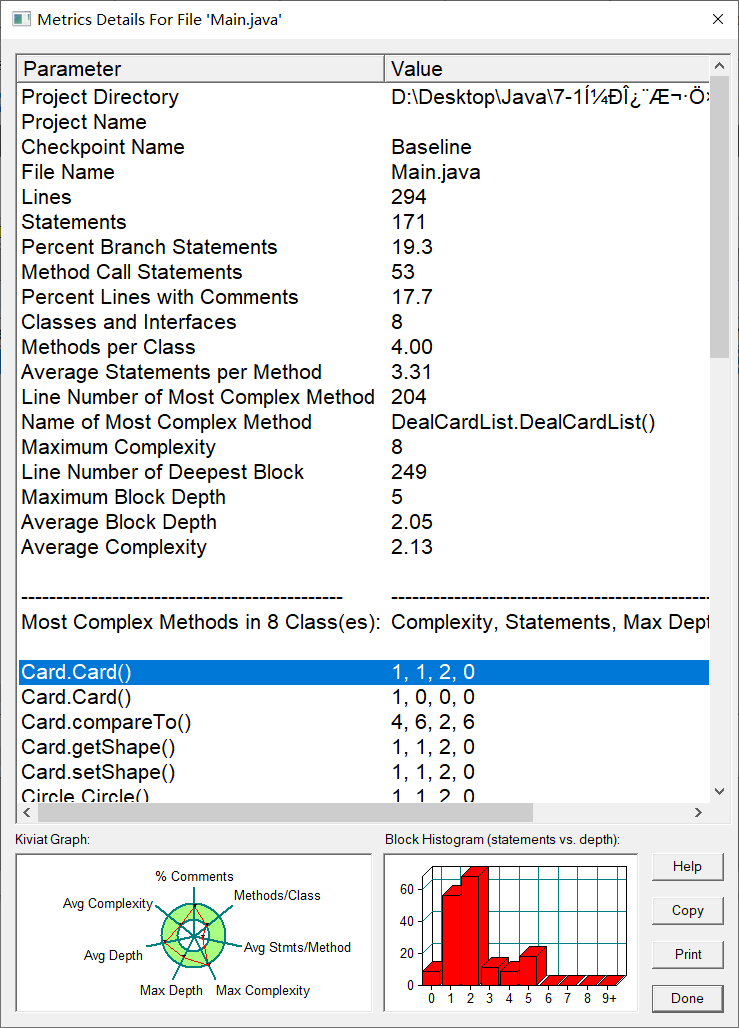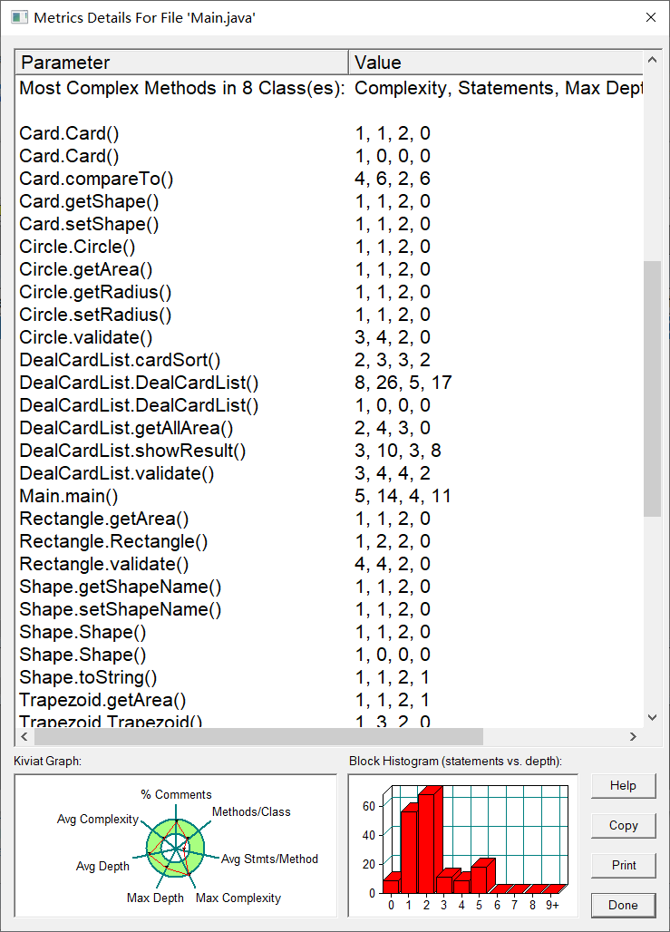 - 从绿圈圈来看各项数据良好,每个函数平均包含的语句个数略少,平均复杂度还是挺低的,代码挺多重复的,方法也因为使用了抽象类而大量重写,只有每个图形的面积计算公式不太一样.