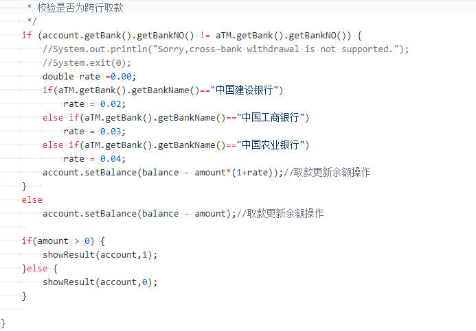 1 //package ATM_luangaiTiJiao; 2 3 import java.util.ArrayList; 4 import java.util.Scanner; 5 import java.util.Iterator; 6 import java.util.regex.Matcher; 7 import java.util.regex.Pattern; 8 9 public class Main { 10 public static void main(String[] args) { 11 Scanner input = new Scanner(System.in); 12 13 UnionPay unionPay = new UnionPay(); 14 15 Bank ccb = new Bank("1001","中国建设银行"); 16 Bank icbc = new Bank("1002","中国工商银行"); 17 Bank abc = new Bank("1003","中国农业银行"); 18 19 unionPay.addBank(ccb); 20 unionPay.addBank(icbc); 21 unionPay.addBank(abc); 22 23 ATM aTM1 = new ATM("01",ccb); 24 ATM aTM2 = new ATM("02",ccb); 25 ATM aTM3 = new ATM("03",ccb); 26 ATM aTM4 = new ATM("04",ccb); 27 ATM aTM5 = new ATM("05",icbc); 28 ATM aTM6 = new ATM("06",icbc); 29 ATM aTM7 = new ATM("07",abc); 30 ATM aTM8 = new ATM("08",abc); 31 ATM aTM9 = new ATM("09",abc); 32 ATM aTM10 = new ATM("10",abc); 33 ATM aTM11 = new ATM("11",abc); 34 35 36 37 ccb.addATM(aTM1); 38 ccb.addATM(aTM2); 39 ccb.addATM(aTM3); 40 ccb.addATM(aTM4); 41 icbc.addATM(aTM5); 42 icbc.addATM(aTM6); 43 abc.addATM(aTM11); 44 abc.addATM(aTM10); 45 abc.addATM(aTM9); 46 abc.addATM(aTM8); 47 abc.addATM(aTM7); 48 49 User Zhangsanfeng = new User("3640000010045442002","张三丰","8208820-THC"); 50 User Linghuchong = new User("3640000010045441009","令狐冲","0"); 51 User Qiaofeng = new User("3630000010033431001","乔峰","1"); 52 53 User Yangguo = new User("360101200102122324","杨过","13856223254"); 54 User Guojing = new User("360101200012302552","郭靖","13800021124"); 55 User Zhangwuji = new User("360502199805163221","张无忌","13952110011"); 56 User Weixiaobao = new User("360201200513243326","韦小宝","13025996587"); 57 User Hongqigong = new User("3630000010033431008","洪七公","7"); 58 59 Account abcAcc1 = new Account("3630000010033431001",10000.00,Qiaofeng,abc); 60 Account ccbAcc4 = new Account("3640000010045442002",10000.00,Zhangsanfeng,ccb); 61 //Account ccbAcc5 = new Account("6640000010045442003",10000.00,Zhangsanfeng,ccb); 62 Account icbcAcc6 = new Account("3640000010045441009",10000.00,Linghuchong,icbc); 63 Account abcAcc2 = new Account("3630000010033431008",10000.00,Hongqigong,abc); 64 65 Account ccbAcc1 = new Account("3217000010041315709",10000.00,Yangguo,ccb); 66 Account ccbAcc2 = new Account("3217000010041315715",10000.00,Yangguo,ccb); 67 Account ccbAcc3 = new Account("3217000010051320007",10000.00,Guojing,ccb); 68 Account icbcAcc1 = new Account("3222081502001312389",10000.00,Zhangwuji,icbc); 69 Account icbcAcc2 = new Account("3222081502001312390",10000.00,Zhangwuji,icbc); 70 Account icbcAcc3 = new Account("3222081502001312399",10000.00,Zhangwuji,icbc); 71 Account icbcAcc4 = new Account("3222081502051320785",10000.00,Weixiaobao,icbc); 72 Account icbcAcc5 = new Account("3222081502051320786",10000.00,Weixiaobao,icbc); 73 74 Card ccbCard1 = new Card("6217000010041315709","88888888",ccbAcc1,"借记"); 75 Card ccbCard2 = new Card("6217000010041315715","88888888",ccbAcc1,"借记"); 76 Card ccbCard3 = new Card("6217000010041315718","88888888",ccbAcc2,"借记"); 77 Card ccbCard4 = new Card("6217000010051320007","88888888",ccbAcc3,"借记"); 78 Card icbcCard5 = new Card("6222081502001312389","88888888",icbcAcc1,"借记"); 79 Card icbcCard6 = new Card("6222081502001312390","88888888",icbcAcc2,"借记"); 80 Card icbcCard7 = new Card("6222081502001312399","88888888",icbcAcc3,"借记"); 81 Card icbcCard8 = new Card("6222081502001312400","88888888",icbcAcc3,"借记"); 82 Card icbcCard9 = new Card("6222081502051320785","88888888",icbcAcc4,"借记"); 83 Card icbcCard10 = new Card("6222081502051320786","88888888",icbcAcc5,"借记"); 84 85 Card ccbCard15 = new Card("6640000010045442002","88888888",ccbAcc4,"贷记"); 86 Card ccbCard11 = new Card("6640000010045442003","88888888",ccbAcc4,"贷记"); 87 Card icbcCard12 = new Card("6640000010045441009","88888888",icbcAcc6,"贷记"); 88 Card abcCard13 = new Card("6630000010033431001","88888888",abcAcc1,"贷记"); 89 Card abcCard14 = new Card("6630000010033431008","88888888",abcAcc2,"贷记"); 90 91 abc.addAccount(abcAcc2); 92 abc.addAccount(abcAcc1); 93 ccb.addAccount(ccbAcc4); 94 icbc.addAccount(icbcAcc6); 95 96 97 Yangguo.addAccount(ccbAcc1); 98 Yangguo.addAccount(ccbAcc2); 99 Guojing.addAccount(ccbAcc3); 100 Zhangwuji.addAccount(icbcAcc1); 101 Zhangwuji.addAccount(icbcAcc2); 102 Zhangwuji.addAccount(icbcAcc3); 103 Weixiaobao.addAccount(icbcAcc4); 104 Weixiaobao.addAccount(icbcAcc5); 105 106 ccb.addAccount(ccbAcc1); 107 ccb.addAccount(ccbAcc2); 108 ccb.addAccount(ccbAcc3); 109 icbc.addAccount(icbcAcc1); 110 icbc.addAccount(icbcAcc2); 111 icbc.addAccount(icbcAcc3); 112 icbc.addAccount(icbcAcc4); 113 icbc.addAccount(icbcAcc5); 114 115 Zhangsanfeng.addAccount(ccbAcc4); 116 Linghuchong.addAccount(icbcAcc6); 117 Qiaofeng.addAccount(abcAcc1); 118 Hongqigong.addAccount(abcAcc2); 119 120 121 122 ccbAcc1.addCard(ccbCard1); 123 ccbAcc1.addCard(ccbCard2); 124 ccbAcc2.addCard(ccbCard3); 125 ccbAcc3.addCard(ccbCard4); 126 icbcAcc1.addCard(icbcCard5); 127 icbcAcc2.addCard(icbcCard6); 128 icbcAcc3.addCard(icbcCard7); 129 icbcAcc3.addCard(icbcCard8); 130 icbcAcc4.addCard(icbcCard9); 131 icbcAcc5.addCard(icbcCard10); 132 133 ccbAcc4.addCard(ccbCard11); 134 icbcAcc6.addCard(icbcCard12); 135 abcAcc1.addCard(abcCard13); 136 abcAcc1.addCard(abcCard13); 137 abcAcc2.addCard(abcCard14); 138 139 StringBuilder sb = new StringBuilder(); 140 141 String data; 142 143 while(!((data = input.nextLine()).equals("#"))) { 144 sb.append(data + "\n"); 145 } 146 147 String[] dt = sb.toString().split("\n"); 148 for(int i = 0; i < dt.length; i++) { 149 String[] dataLine = dt[i].toString().split("\\s+"); 150 151 if(dataLine.length == 1) { 152 GetBalance gb = new GetBalance(unionPay); 153 System.out.println("业务:查询余额 "+String.format("¥%.2f", gb.getBalance(dataLine[0]))); 154 }else { 155 Withdraw wd = new Withdraw(unionPay,dataLine[0],dataLine[1],dataLine[2],Double.parseDouble(dataLine[3])); 156 w