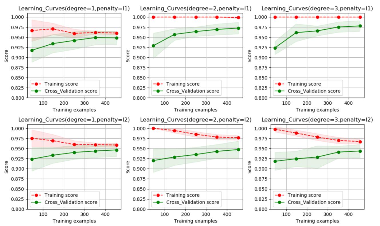 1 #载入数据 2 from sklearn.datasets import load_breast_cancer 3 from sklearn.linear_model import LogisticRegression 4 from sklearn.model_selection import train_test_split 5 from sklearn.model_selection import cross_val_predict 6 from sklearn.model_selection import ShuffleSplit 7 from sklearn.preprocessing import PolynomialFeatures 8 from sklearn.model_selection import learning_curve 9 from sklearn.model_selection import ShuffleSplit 10 from sklearn.pipeline import Pipeline 11 import numpy as np 12 import matplotlib.pyplot as plt 13 import time 14 from common.utils import plot_learning_curve 15 16 %pylab 17 # np.random.seed(6) 18 19 #增加多项式做预处理 20 def polynomial_model(degree=1,**kwarg): 21 polynomial_features = PolynomialFeatures(degree=degree, 22 include_bias=False) 23 logistic_regression = LogisticRegression(**kwarg) 24 pipeline = Pipeline([("polynomial_features",polynomial_features), 25 ("logistic_regression",logistic_regression)]) 26 return pipeline 27 28 # 学习曲线的绘制 29 def plot_learning_curve(plt,estimator,title,X,y,ylim=None,cv=None, 30 n_jobs=1,train_sizes=np.linspace(.1,1.0,5)): 31 """ 32 estimator:实现'fit'和'predict'方法的对象类型 33 title:字符串:图标抬头 34 X,y:图标x,y 35 ylim:元祖,(ymin,ymax),可选择定义图像的最小和最大y值 36 cv:int,交叉验证生成器,可选择和决定交叉验证的生成策略,cv的可能输入有: 37 - None,使用默认的3-fold交叉验证 38 - Integer,指定折叠的数量 39 --如实上述两种情况,如果'y'是个二元的或者多元分类,使用StratifiedKFold 40 --如果'y'不是分类问题,使用KFold 41 - 一个对象,可被用来作为cv生成器 42 - 一个迭代器 43 n_jobs:整数,同时运行的工作数量 44 train_sizes:表示把训练样本数量从0.1~1分成5等分,生成[0.1,0.325,0.55,0.775,1]的 45 序列,从序列中取出训练样本数量百分比,逐个计算在当前训练样本数量情况下训练出来的 46 模型准确性。 47 """ 48 plt.title(title) 49 if ylim is not None: 50 plt.ylim(*ylim) 51 plt.xlabel("Training examples") 52 plt.ylabel("Score") 53 train_sizes,train_scores,test_scores=learning_curve(estimator, 54 X,y,cv=cv,n_jobs=n_jobs,train_sizes=train_sizes) 55 train_scores_mean = np.mean(train_scores,axis = 1) 56 train_scores_std = np.std(train_scores,axis = 1) 57 test_scores_mean = np.mean(test_scores,axis = 1) 58 test_scores_std = np.std(test_scores,axis = 1) 59 plt.grid(True) 60 plt.fill_between(train_sizes, train_scores_mean - train_scores_std, 61 train_scores_mean + train_scores_std, alpha=0.1, 62 color="r") 63 plt.fill_between(train_sizes,test_scores_mean-test_scores_std, 64 test_scores_mean+test_scores_std,alpha=0.1,color='g') 65 plt.plot(train_sizes,train_scores_mean,'o--',color="r", 66 label = "Training score") 67 plt.plot(train_sizes,test_scores_mean,'o-',color="g", 68 label = "Cross_Validation score") 69 plt.legend(loc="best") 70 return plt 71 72 cancer = load_breast_cancer() 73 X = cancer.data 74 y = cancer.target 75 print('data shape:{0}'.format(X.shape)) 76 print('no.features:{0}'.format(X.shape[1])) 77 print('features name:{0}'.format(cancer.feature_names)) 78 print('no.postive:{0}'.format(y[y==1].shape[0])) 79 print('no.negative:{0}'.format(y[y==0].shape[0])) 80 # print(cancer.data[0]) 81 82 #模型训练 训练集和测试集 83 X_train,X_test,y_train,y_test = train_test_split(X,y,test_size = 0.2) 84 85 #模型训练 86 model = LogisticRegression() 87 model.fit(X_train,y_train) 88 train_score = model.score(X_train,y_train) 89 test_score = model.score(X_test,y_test) 90 print('\ntrain score:{}'.format(train_score)) 91 print('test score:{}'.format(test_score)) 92 93 #样本预测 94 y_pred = model.predict(X_test) 95 print('\nmatchs:{0}/{1}'.format(np.equal(y_pred,y_test).shape[0],y_test.shape[0])) 96 97 #预测概率 找出预测“自信度”低于90%的样本 阳性,阴性均大于0.1 98 y_pred_proba = model.predict_proba(X_test) 99 #找出第一列预测为阴性的概率大于0.1的样本,保存在result中 100 y_pred_proba_0 = y_pred_proba[:,0]>0.1 101 result = y_pred_proba[y_pred_proba_0] 102 #找出第二列预测为阳性的概率大于0.1的样本 103 y_pred_prob_1 = result[:,1]>0.1 104 print(result[y_pred_prob_1]) 105 106 # np.random.seed(3) 107 #模型优化 108 X_train1,X_test1,y_train1,y_test1 = train_test_split(X,y,test_size = 0.2) 109 model_adjust = polynomial_model(degree=2,penalty = 'l1') 110 start = time.clock() 111 model_adjust.fit(X_train1,y_train1) 112 train_score1 = model.score(X_train1,y_train1) 113 cv_score = model.score(X_test1,y_test1) 114 print('\ntrain score:{0:.6f}'.format(train_score1)) 115 print('test score:{0:.6f}'.format(cv_score)) 116 logistic_regression = model_adjust.named_steps['logistic_regression'] 117 #coef_里面保存的是模型参数,增加二阶多项式后,特征由30-->495个,其实有用的只有94个 118 print('\nmodel parameters shape:{0}'.format(logistic_regression.coef_.shape)) 119 print('count of non-zero element:{0}'.format(np.count_nonzero(logistic_regression.coef_))) 120 121 #首先画出L1作为正则项的一二三阶多项式学习曲线 122 cv = ShuffleSplit(n_splits=10,test_size=0.2,random_state=0) 123 title = 'Learning_Curves(degree={0},penalty={1})' 124 degrees = [1,2,3] 125 penalty = ['l1','l2'] 126 index_penalty = 0 127 index_degrees = 0 128 count = 0 129 plt.figure(figsize=(15,4),dpi=100) 130 for i in range(6): 131 plt.subplot(2,len(degrees),i+1) 132 plot_learning_curve(plt,polynomial_model(degree=degrees[index_degrees],\ 133 penalty=penalty[index_penalty]),\ 134 title.format(degrees[index_degrees],penalty[index_penalty]),\ 135 X,y,ylim=(0.8,1.01),cv=cv) 136 if i==len(degrees)-1: 137 index_penalty+=1 138 index_degrees=-1 139 index_degrees+=1 140 141 142 143 144