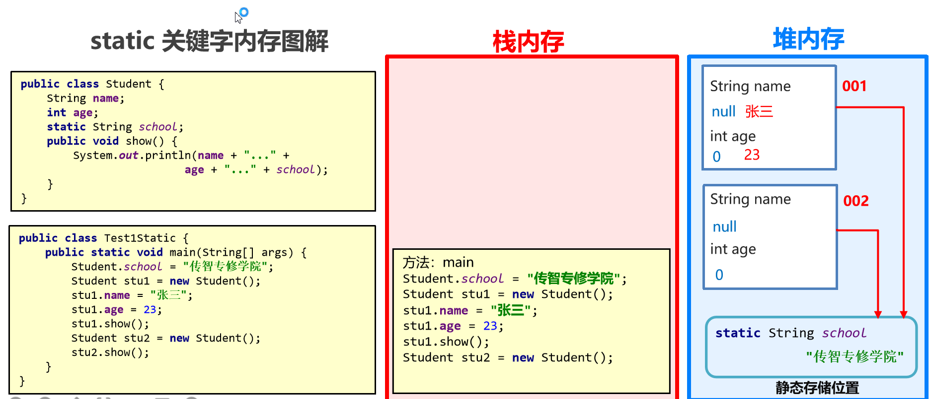 public class Student { String name; int age; static String school; public void show() { System.out.println(name + "---" + age + "---" + school); } } /* static关键字的特点 : 1 静态成员被该类的所有对象的进行共享 2 静态成员可以通过类名调用 , 也可以通过对象进行调用 , 推荐使用类名 3 静态成员随着类的加载而加载 , 优先于对象存在 */ public class StudentTest { public static void main(String[] args) { Student.school = "传智专修学院"; Student s = new Student(); s.name = "张三"; s.age = 23; s.show(); Student s2 = new Student(); s2.show(); } } -