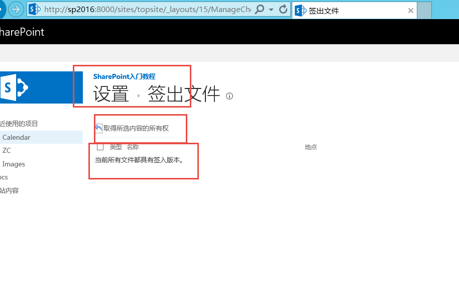 2.获取所选内容签出权 文档库,设置,管理没有已签入版本的文件