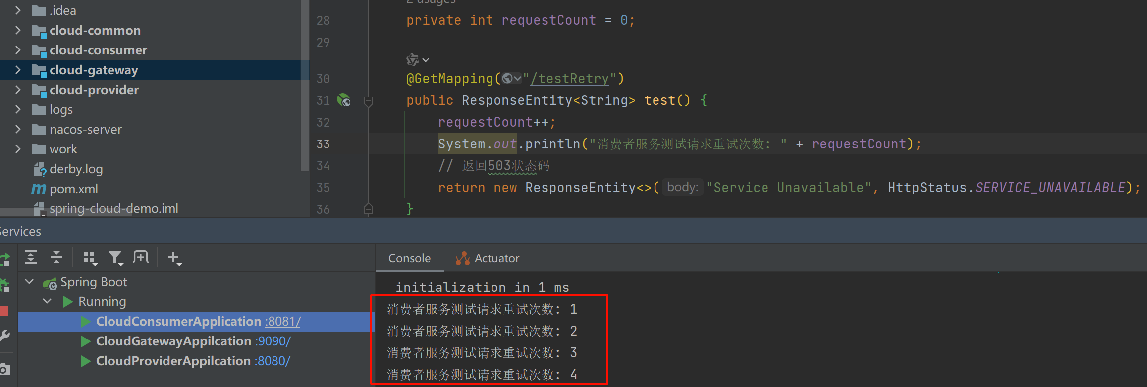 /** * 重试过滤器测试 * */ private int requestCount = 0; @GetMapping("/testRetry") public ResponseEntity<String> test() { requestCount++; System.out.println("生产者服务测试请求重试次数: " + requestCount); // 返回503状态码 return new ResponseEntity<>("Service Unavailable", HttpStatus.SERVICE_UNAVAILABLE); }