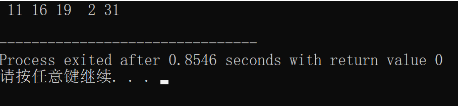 #include <stdio.h> #include <stdlib.h> #include <time.h> #define N 5 int main() { int x, n; srand(time(0)); for(n=1; n<=N; n++) { x = rand() % 32; printf("%3d", x); } printf("\n"); return 0; }