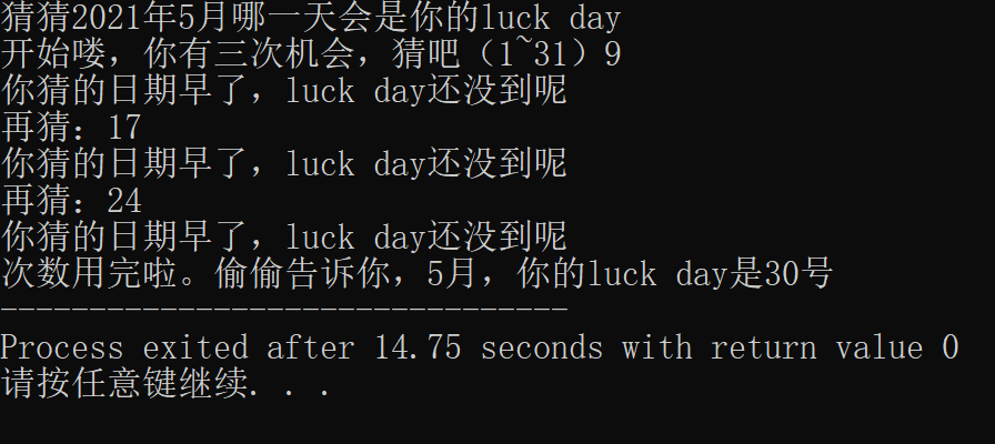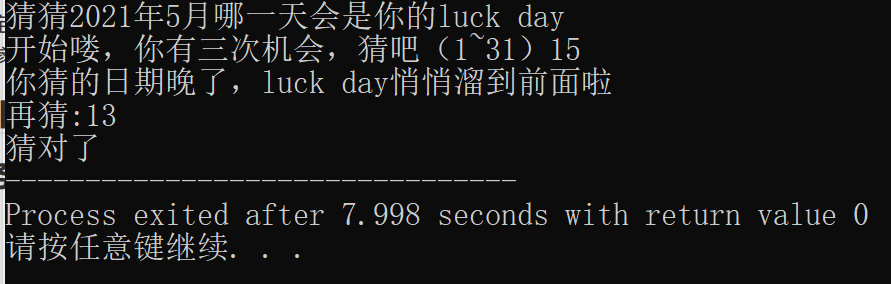 #include <stdio.h> #include <stdlib.h> #include <time.h> #define N 1 int main() { int x, n,m; n=0; printf("猜猜2021年5月哪一天会是你的luck day\n开始喽,你有三次机会,猜吧(1~31)"); srand(time(0)); x = rand() % 32; while(n<3){ scanf("%d",&m); if(m<x){ if(n<2) printf("你猜的日期早了,luck day还没到呢\n再猜:"); else printf("你猜的日期早了,luck day还没到呢"); } else if(m>x){ if(n<2) printf("你猜的日期晚了,luck day悄悄溜到前面啦\n再猜:"); else printf("你猜的日期晚了,luck day悄悄溜到前面啦"); } else{ printf("猜对了"); return 0; } n++; } printf("\n次数用完啦。偷偷告诉你,5月,你的luck day是%d号",x); return 0; }