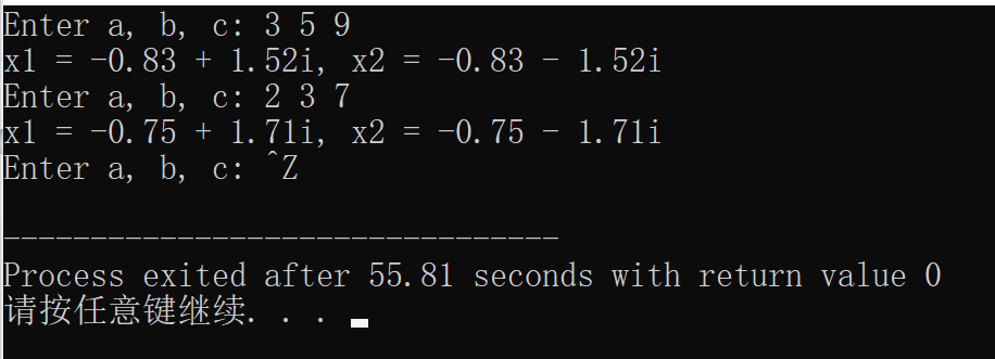 #include <math.h> #include <stdio.h> void solve(double a, double b, double c); int main() { double a, b, c; printf("Enter a, b, c: "); while(scanf("%lf%lf%lf", &a, &b, &c) != EOF) { solve(a, b, c); printf("Enter a, b, c: "); } return 0; } void solve(double a, double b, double c) { double x1, x2; double delta, real, imag; if(a == 0) printf("not quadratic equation.\n"); else { delta = b*b - 4*a*c; if(delta >= 0) { x1 = (-b + sqrt(delta)) / (2*a); x2 = (-b - sqrt(delta)) / (2*a); printf("x1 = %.2f, x2 = %.2f\n", x1, x2); } else { real = -b/(2*a); imag = sqrt(-delta) / (2*a); printf("x1 = %.2f + %.2fi, x2 = %.2f - %.2fi\n", real, imag,real, imag); } } }