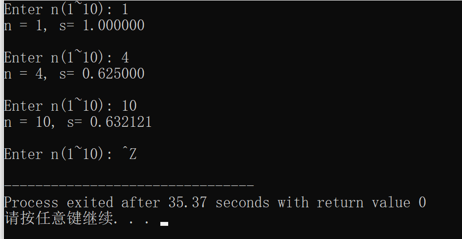 #include <stdio.h> double fun(int n); int main() { int n; double s; printf("Enter n(1~10): "); while(scanf("%d", &n) != EOF) { s = fun(n); printf("n = %d, s= %f\n\n", n, s); printf("Enter n(1~10): "); } return 0; } double fun(int n) { double p=1,q=0,i; for(i=1;i<=n;i++){ q=q+p; p=(-1)*p*(1/(i+1)); } return q; }