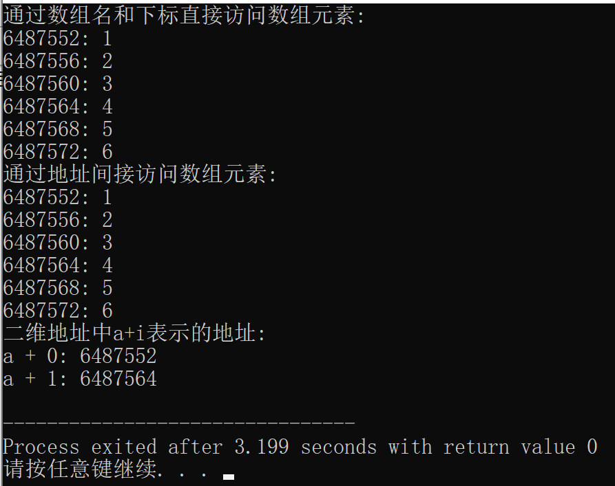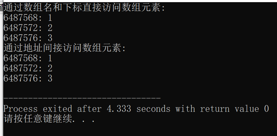 #include <stdio.h> const int N=3; int main() { int a[N] = {1, 2, 3}; int i; printf("通过数组名和下标直接访问数组元素:\n"); for(i=0; i<N; i++) printf("%d: %d\n", &a[i], a[i]); printf("通过地址间接访问数组元素:\n"); for(i=0; i<N; i++) printf("%d: %d\n", a+i, *(a+i)); return 0; }
