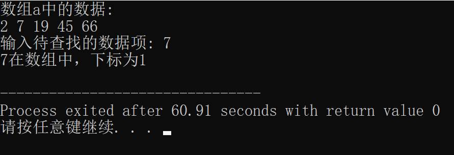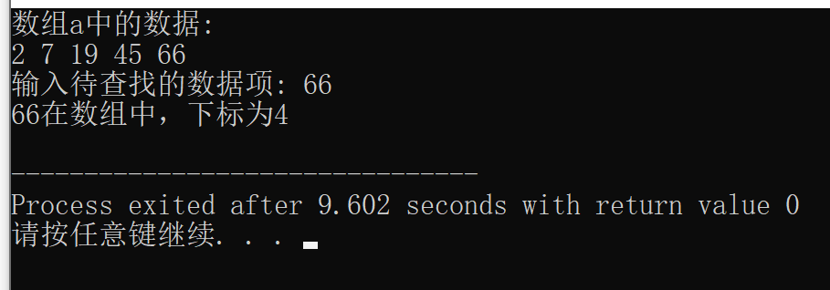 #include <stdio.h> const int N=5; int binarySearch(int *x, int n, int item); // 函数声明 int main() { int a[N]={2,7,19,45,66}; int i,index, key; printf("数组a中的数据:\n"); for(i=0;i<N;i++) printf("%d ",a[i]); printf("\n"); printf("输入待查找的数据项: "); scanf("%d", &key); // 调用函数binarySearch()在数组a中查找指定数据项key,并返回查找结果给index // 补足代码① // ××× index=binarySearch(a,N,key) ; if(index>=0) printf("%d在数组中,下标为%d\n", key, index); else printf("%d不在数组中\n", key); return 0; } //函数功能描述: //使用二分查找算法在从x中查找特定值item,数组x大小为n // 如果找到,返回其下标 // 如果没找到,返回-1 int binarySearch(int *x, int n, int item) { int low, high, mid; low = 0; high = n-1; while(low <= high) { mid = (low+high)/2; if ( item == *(x+mid) ) return mid; else if(item < *(x+mid)) high=mid-1; else low=mid+1; } return -1; }