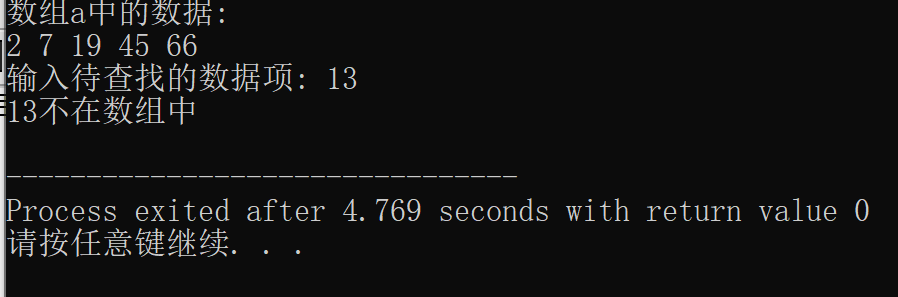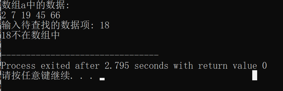 // 练习:使用二分查找,在一组有序元素中查找数据项 // 形参是数组,实参是数组名 #include <stdio.h> const int N=5; int binarySearch(int x[], int n, int item); // 函数声明 int main() { int a[N]={2,7,19,45,66}; int i,index, key; printf("数组a中的数据:\n"); for(i=0;i<N;i++) printf("%d ",a[i]); printf("\n"); printf("输入待查找的数据项: "); scanf("%d", &key); // 调用函数binarySearch()在数组a中查找指定数据项key,并返回查找结果给index index=binarySearch(a,N,key) ; // ××× if(index>=0) printf("%d在数组中,下标为%d\n", key, index); else printf("%d不在数组中\n", key); return 0; } //函数功能描述: //使用二分查找算法在数组x中查找特定值item,数组x大小为n // 如果找到,返回其下标 // 如果没找到,返回-1 int binarySearch(int x[], int n, int item) { int low, high, mid; low = 0; high = n-1; while(low <= high) { mid = (low+high)/2; if (item==x[mid]) return mid; else if(item<x[mid]) high = mid - 1; else low = mid + 1; } return -1; }