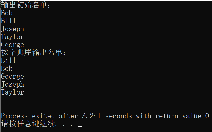 #include<stdio.h> #include<string.h> const int N=5; void selectSort(char str[][20],int n); //函数声明,形参str是二维数组名 int main() { char name[][20]={"Bob","Bill","Joseph","Taylor","George"}; int i; printf("输出初始名单:\n"); for(i=0;i<N;i++) printf("%s\n",name[i]); selectSort(name,N); //调用选择法对name数组中的字符串排序 printf("按字典序输出名单:\n"); for(i=0;i<N;i++) printf("%s\n",name[i]); return 0; } //函数定义 //函数功能描述:使用选择法对二维数组str中的n个字符串按字典序排序 void selectSort(char str[][20],int n) { int i,j,k; char t[20]; for(i=0;i<n-1;i++) { k=i; for(j=i+1;j<n;j++) if(strcmp(str[j],str[k])<0) k=j; if(k!=i) { strcpy(t,str[i]); strcpy(str[i],str[k]); strcpy(str[k],t); } } }