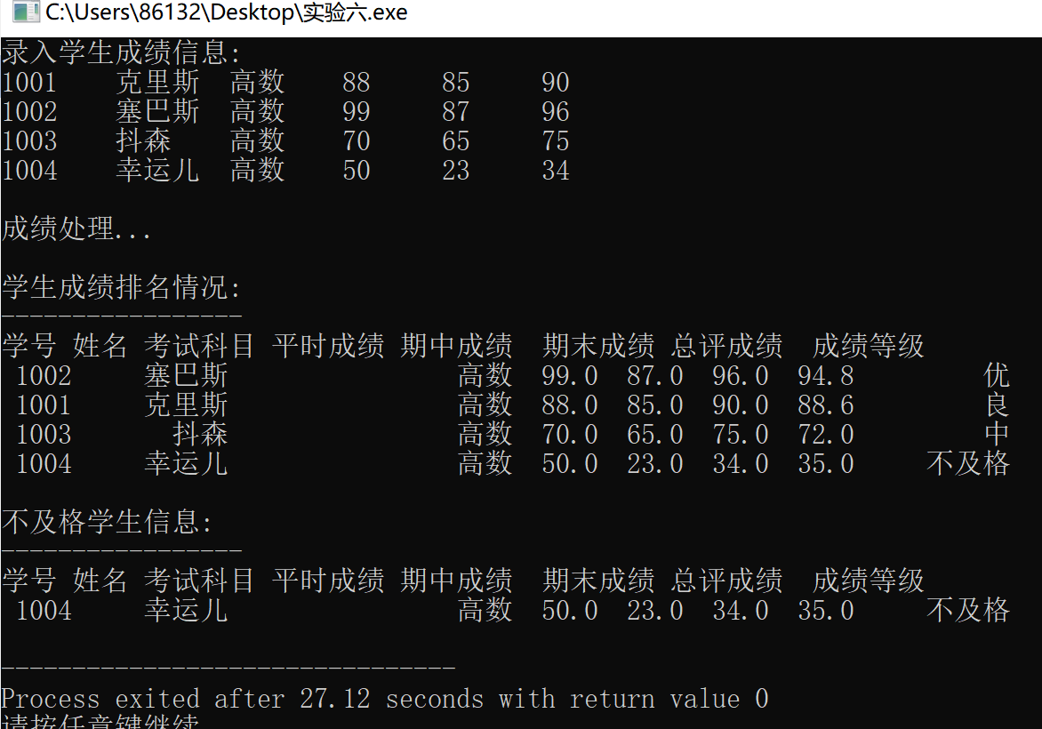 #include<stdio.h> #include<stdlib.h> #include<string.h> #define N 4 // 运行程序输入测试时,可以把N改小一些输入测试 typedef struct student { int id; /*学生学号 */ char name[20]; /*学生姓名 */ char subject[20]; /*考试科目 */ float perf; /*平时成绩 */ float mid; /* 期中成绩 */ float final; /* 期末成绩 */ float total; /* 总评成绩 */ char level[10]; /* 成绩等级 */ } STU; void input(STU[],int ); /*输入学生信息 */ void calc(STU[],int); /*计算总评和等级 */ int fail(STU[],STU [],int); /*不及格学生统计 */ void sort(STU[],int); /*排序 */ void print(STU[], int); /*输出学生信息*/ int main() { STU st[N],fst[N]; // 数组st记录学生信息,fst记录不及格学生信息 int k; // 用于记录不及格学生个数 printf("录入学生成绩信息:\n"); input(st,N); printf("\n成绩处理...\n"); calc(st,N); k = fail(st,fst,N); sort(st, N); printf("\n学生成绩排名情况:\n"); print(st, N); printf("\n不及格学生信息:\n"); print(fst, k); return 0; } // 输入学生信息 void input(STU s[],int n) { int i; for(i=0;i<n;i++) scanf("%d %s %s %f %f %f",&s[i].id,s[i].name,s[i].subject,&s[i].perf,&s[i].mid,&s[i].final); } // 计算总评和等级 void calc(STU s[],int n) { int i; for(i=0;i<n;i++) { s[i].total=s[i].perf*0.2+s[i].mid*0.2+s[i].final*0.6; if(s[i].total>=90) strcpy(s[i].level,"优"); // 注意:等级是字符型数组,要使用strcpy完成赋值 else if(s[i].total>=80 && s[i].total<90) strcpy(s[i].level,"良"); else if(s[i].total>=70 && s[i].total<80) strcpy(s[i].level,"中"); else if(s[i].total>=60 && s[i].total<70) strcpy(s[i].level,"及格"); else strcpy(s[i].level,"不及格"); } } // 不及格学生统计 // 数组s存放的是所有学生信息,数组t存放不及格学生信息,n是数组s中元素个数 // 函数返回值:返回的是不及格人数 int fail(STU s[],STU t[],int n) { int i,k=0; for(i=0;i<n;i++) if(s[i].total<60) t[k++]=s[i]; return k; } // 根据总评成绩对学生记录信息排序 // 使用的是冒泡排序算法 void sort(STU s[],int n) { int i,j; STU temp; for(i=0;i<n-1;i++) for(j=0;j<n-1-i;j++) if(s[j].total<s[j+1].total) { temp = s[j]; s[j] = s[j+1]; s[j+1] = temp; } } // 输出学生信息 void print(STU s[], int n) { int i; printf("-----------------\n"); printf("学号 姓名 考试科目 平时成绩 期中成绩 期末成绩 总评成绩 成绩等级\n"); for(i=0;i<n;i++) printf("%5d %10s%20s %5.1f %5.1f %5.1f %5.1f %10s\n",s[i].id,s[i].name,s[i].subject,s[i].perf,s[i].mid,s[i].final,s[i].total,s[i].level); }