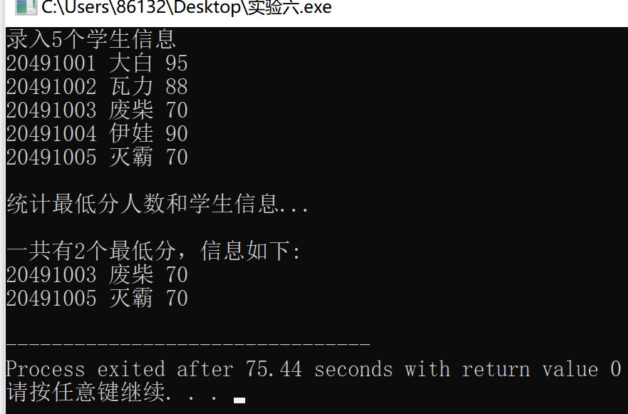#include <stdio.h> const int N=5; // 定义结构体类型struct student,并定义STU为其别名 typedef struct student { long no; char name[20]; int score; }STU; // 函数声明 void input(STU s[], int n); int findMinlist(STU s[], STU t[], int n); void output(STU s[], int n); int main() { STU stu[N], minlist[N]; int count; printf("录入%d个学生信息\n", N); input(stu, N); printf("\n统计最低分人数和学生信息...\n"); count = findMinlist(stu, minlist, N); printf("\n一共有%d个最低分,信息如下:\n", count); output(minlist, count); return 0; } // 输入n个学生信息,存放在结构体数组s中 void input(STU s[], int n) { int i; for(i=0; i<n; i++) scanf("%ld %s %d", &s[i].no, s[i].name, &s[i].score); } // 输出结构体s中n个元素信息 void output(STU s[], int n) { int i; for(i=0; i<n; i++) printf("%ld %s %d\n", s[i].no, s[i].name, s[i].score); } // 在结构体数组s中,查找最低分学生的记录,将其存入结构体数组t中 // 形参n是结构体数组s中元素个数 // 函数返回最低分的学生人数 int findMinlist(STU s[], STU t[], int n) { int i, j=0, min; min=s[0].score; for(i=0;i<n;i++){ if(s[i].score<min) min = s[i].score; } for(i=0;i<n;i++){ if(s[i].score==min) t[j++]=s[i]; } return j; }