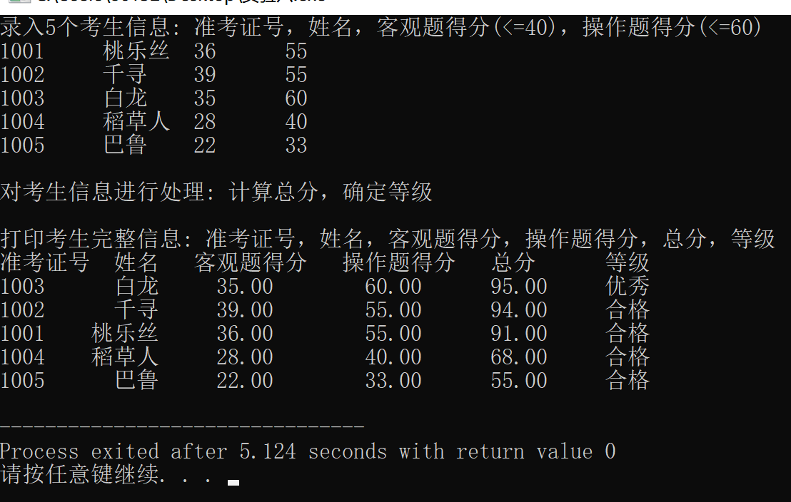 #include <stdio.h> #include <string.h> const int N = 5; // 定义结构体类型struct student,并定义其别名为STU typedef struct student { long int id; char name[20]; float objective; /*客观题得分*/ float subjective; /*操作题得分*/ float sum; char level[10]; }STU; // 函数声明 void input(STU s[], int n); void output(STU s[], int n); void process(STU s[], int n); int main() { STU stu[N]; printf("录入%d个考生信息: 准考证号,姓名,客观题得分(<=40),操作题得分(<=60)\n", N); input(stu, N); printf("\n对考生信息进行处理: 计算总分,确定等级\n"); process(stu, N); printf("\n打印考生完整信息: 准考证号,姓名,客观题得分,操作题得分,总分,等级\n"); output(stu, N); return 0; } // 录入考生信息:准考证号,姓名,客观题得分,操作题得分 void input(STU s[], int n) { // 补足代码 int i; for(i=0;i<n;i++) scanf("%ld %s %f %f",&s[i].id,s[i].name,&s[i].objective,&s[i].subjective); } //输出考生完整信息: 准考证号,姓名,客观题得分,操作题得分,总分,等级 void output(STU s[], int n) { // 补足代码 int i; printf("准考证号 姓名 客观题得分 操作题得分 总分 等级\n"); for(i=0;i<n;i++) printf("%4ld %6s %5.2f %.2f %6.2f %4s\n", s[i].id, s[i].name, s[i].objective, s[i].subjective, s[i].sum, s[i].level); } // 对考生信息进行处理:计算总分,排序,确定等级 void process(STU s[], int n) { // 补足代码 int i,j; STU t; for(i=0;i<n;i++) s[i].sum=s[i].objective+s[i].subjective; for(i=0;i<n-1;i++){ for(j=0;j<n-1-i;j++) if(s[j].sum<s[j+1].sum){ t=s[j]; s[j]=s[j+1]; s[j+1]=t; } } for(i=0;i<n;i++){ if(i<1) strcpy(s[i].level,"优秀"); else if(i>=1&&i<=5) strcpy(s[i].level,"合格"); else strcpy(s[i].level,"不合格"); } }