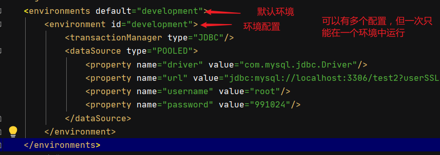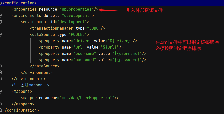 <?xml version="1.0" encoding="UTF-8" ?> <!DOCTYPE configuration PUBLIC "-//mybatis.org//DTD Config 3.0//EN" "http://mybatis.org/dtd/mybatis-3-config.dtd"> <configuration> <environments default="development"> <environment id="development"> <transactionManager type="JDBC"/> <dataSource type="POOLED"> <property name="driver" value="com.mysql.jdbc.Driver"/> <property name="url" value="jdbc:mysql://localhost:3306/test2?userSSL=true&userUnicode=true&characterEncode=UTF-8"/> <property name="username" value="root"/> <property name="password" value="991024"/> </dataSource> </environment> </environments> <!--注册mapper,注意这里文件夹之间不能用 . 只能用 / --> <mappers> <mapper resource="mrh/dao/UserMapper.xml"/> </mappers> </configuration> -