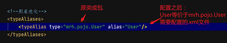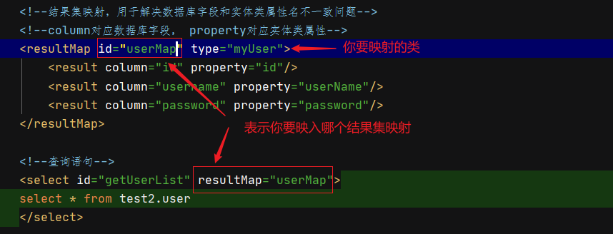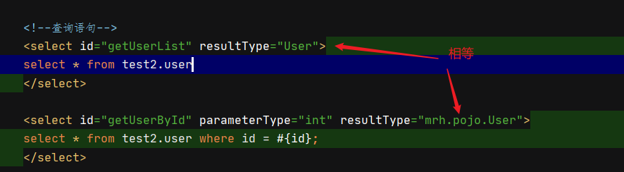 <?xml version="1.0" encoding="UTF-8" ?> <!DOCTYPE mapper PUBLIC "-//mybatis.org//DTD Mapper 3.0//EN" "http://mybatis.org/dtd/mybatis-3-mapper.dtd"> <!--namesapace指定一个Dao/Mapper接口--> <mapper namespace="mrh.dao.UserDao"> <!--查询语句--> <select id="getUserList" resultType="mrh.pojo.User"> select * from test2.user </select> </mapper> -
