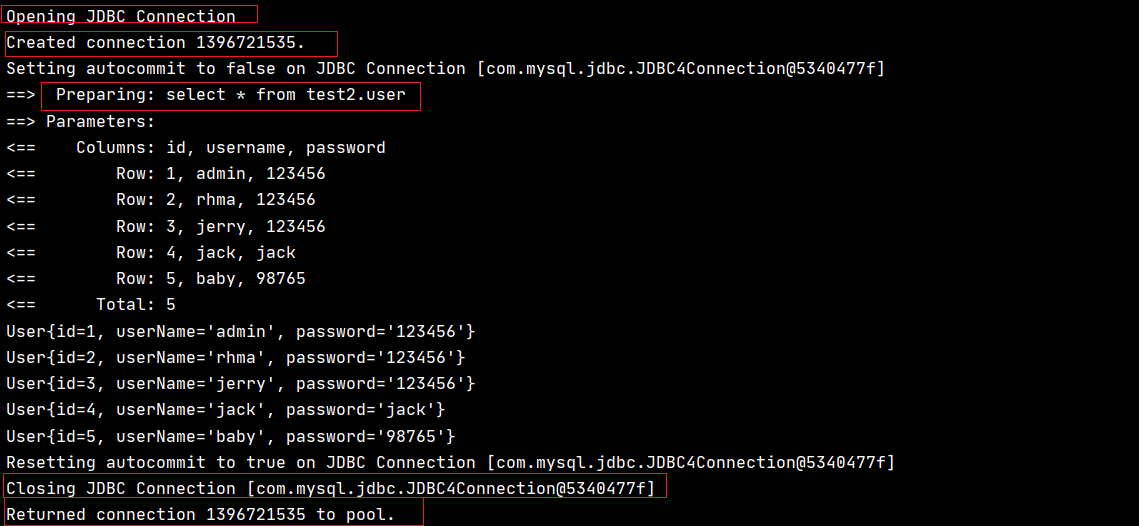 package mrh.dao; import mrh.pojo.User; import mrh.util.MybaitsUtil; import org.apache.ibatis.session.SqlSession; import org.junit.Test; import java.util.List; /** * @ClassName UserDaoTest * @Description TODO * @Author m * @Version 1.0 */ public class UserDaoTest { @Test public void test(){ //1.获取sqlSession对象 SqlSession sqlSession = MybaitsUtil.getSqlSession(); //getMapper UserDao userDao = sqlSession.getMapper(UserDao.class); List<User> userList = userDao.getUserList(); for (User user : userList) { System.out.println(user.toString()); } sqlSession.close(); } }问题1: