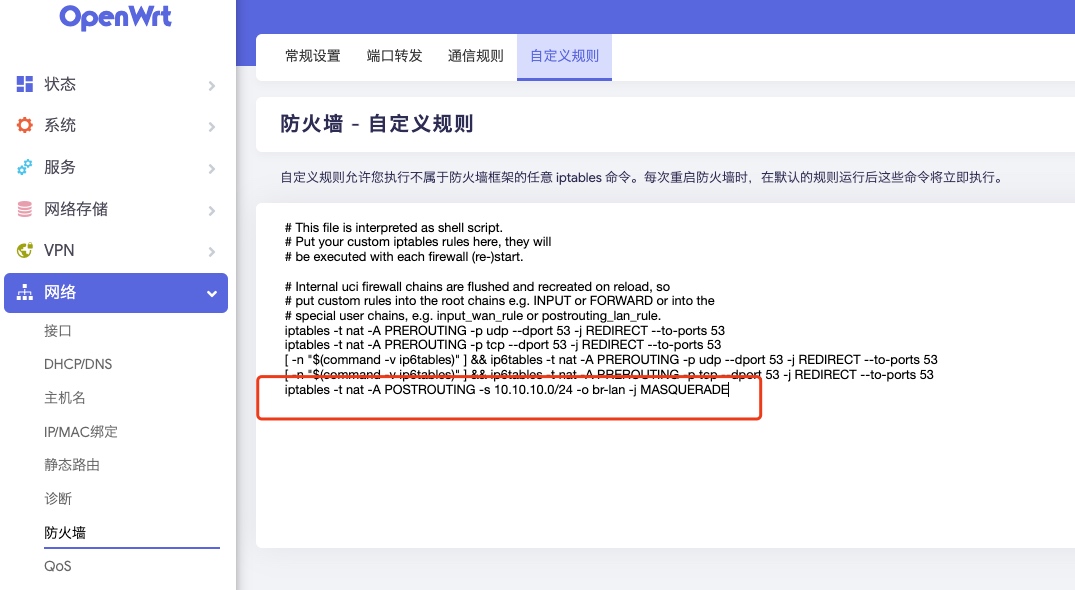 iptables -t nat -A POSTROUTING -s 10.10.10.0/24 -o br-lan -j MASQUERADE