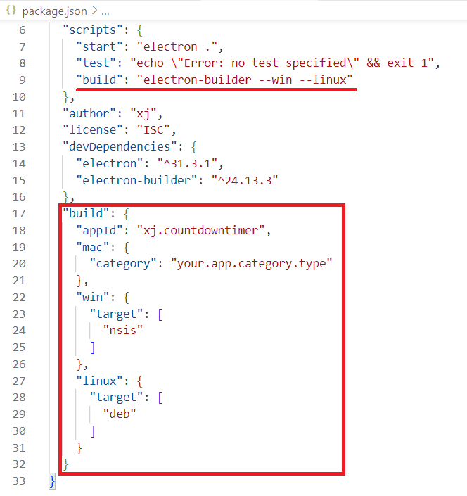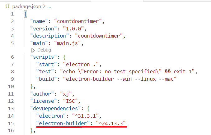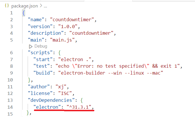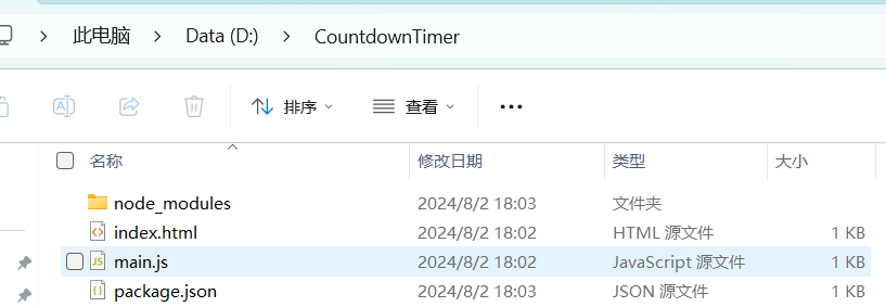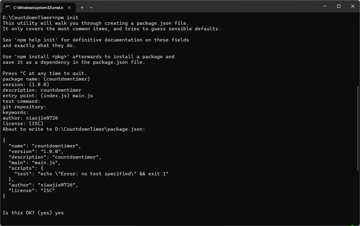 2、在CountdownTimer目录下命令行运行npm init生成package.json文件,过程中指定程序入口为main.js