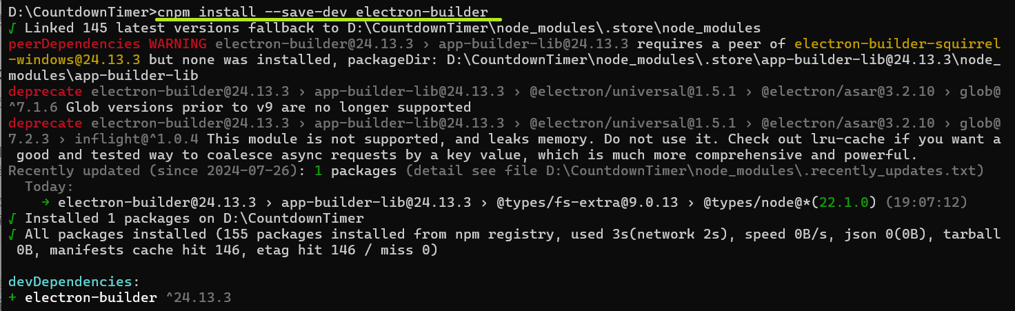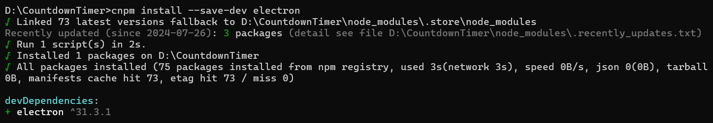 3、在项目CountdownTimer目录下命令行运行cnpm install --save-dev electron生成程序的依赖目录node_modules