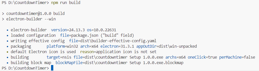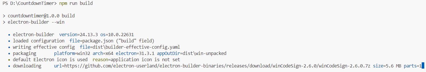 下载https://registry.npmmirror.com/-/binary/electron/v31.3.1/electron-v31.3.1-win32-x64.zip后,放到C:\Users\<用户名>\AppData\Local\electron\Cache下面后,再打包: