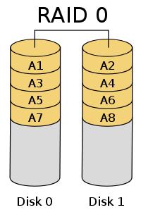 RAID 0(无校验和镜像的块级数据分割)不提供冗余,提供更高的性能和更大的存储空间,无容错能力。一个驱动器发生故障,破坏整个阵列,因为当数据被写入到RAID 0卷,数据被分解成称为块碎片。分割大小决定块数,这是一个阵列的配置参数。块被同时写入各自的驱动器的同一扇区。整个数据块的小部分在每个驱动器并行被读出,增加了带宽。 RAID 0不执行错误检查,所以任何错误是无法纠正的。更多的驱动器阵列,意味着更高的带宽,但数据丢失的风险更大,只要坏了一个盘,所有数据丢失。
