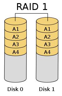 RAID 1(无奇偶校验和数据分割的镜像),相同的数据被写入多个驱动器,从而产生一种“镜像集”,要求至少有两个驱动器构成这样的一个数组。除非拥有相同资料的主磁盘与镜像同时损坏,否则只要一个磁盘正常即可维持运作,可靠性最高。RAID 1就是镜像。其原理为在主硬盘上存放数据的同时也在镜像硬盘上写一样的数据。当主硬盘(物理)损坏时,镜像硬盘则代替主硬盘的工作。因为有镜像硬盘做数据备份,所以RAID 1的数据安全性在所有的RAID级别上来说是最好的。但无论用多少磁盘做RAID 1,仅算一个磁盘的容量,是所有RAID上磁盘利用率最低的一个级别。